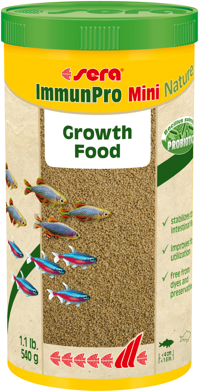 sera ImmunPro Nature & ImmunPro Mini Nature are growth & breeder foods for all ornamental fish. The probiotics are applied to the food in a particularly gentle procedure and stabilize the intestinal flora. They reduce water pollution because of more efficient food utilization. Due to the high protein percentage of more than 50%, the addition of probiotics and other functional ingredients such as MOS, Haematococcus (rich in natural astaxanthin) and Spirulina, the breeder food ensures quick growth, strong development, and brilliant coloration of the fish. This food contains the intestinal flora stabilizer Bacillus subtilis, which is approved for ornamental fish since June 2016, and is expressly recommended by the EFSA (European authority for food safety) for use in ornamental fish food to improve growth and food utilization.